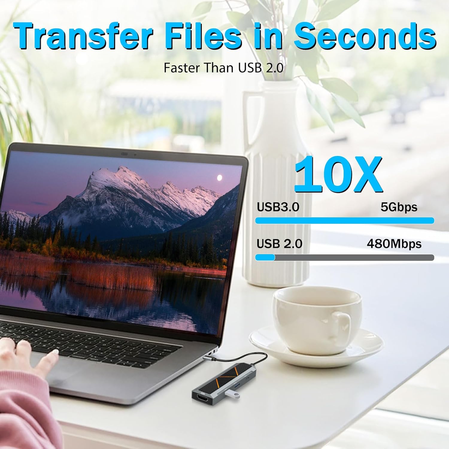 Die Hochgeschwindigkeits-Datenübertragung gewährleistet eine effiziente Dateifreigabe und Gerätekommunikation, sodass sich der 4-in-1-USB-C-Hub mit 4K-60-Hz-HDMI-Splitter sowohl für Büro- als auch für kreative Arbeitsumgebungen eignet.