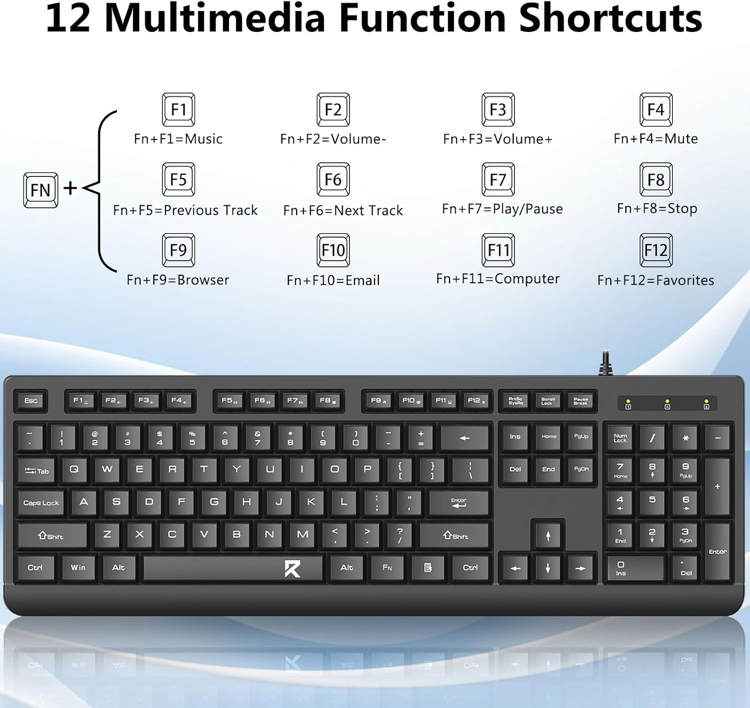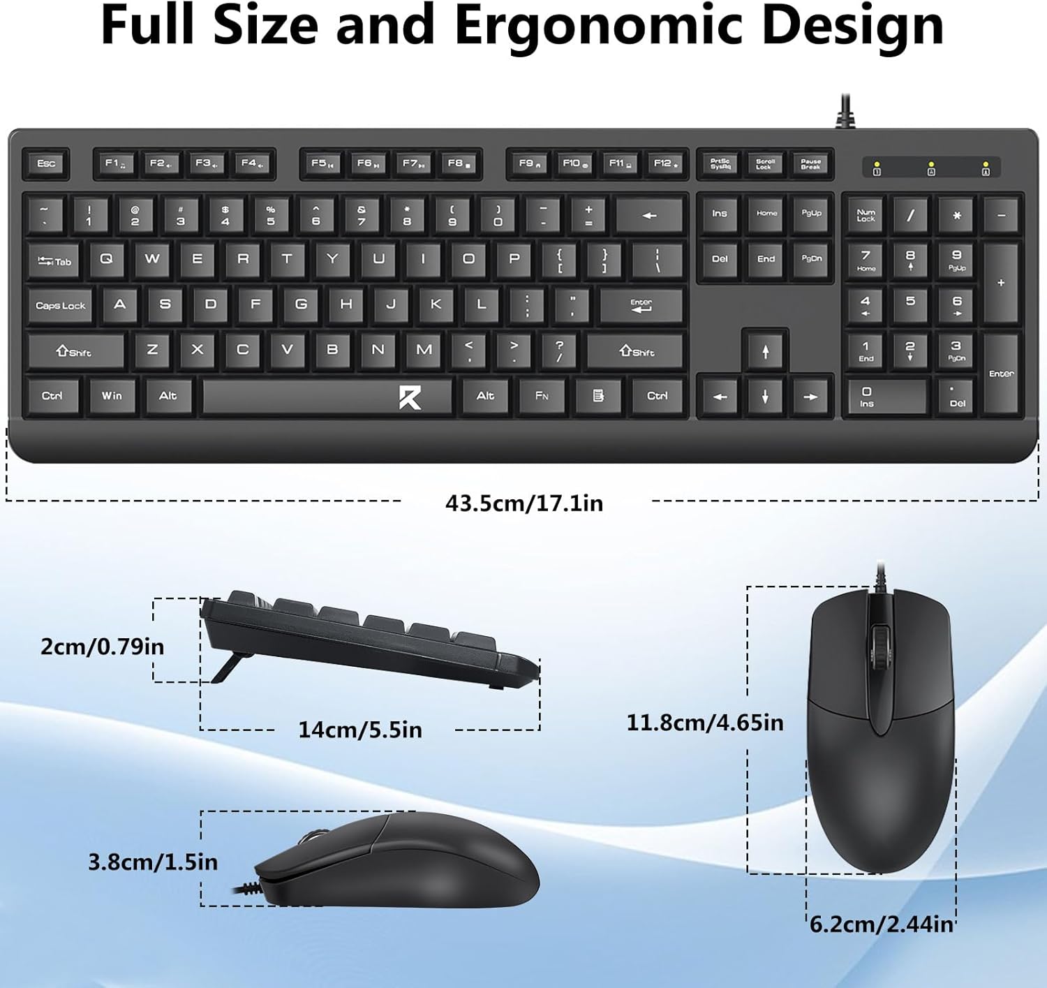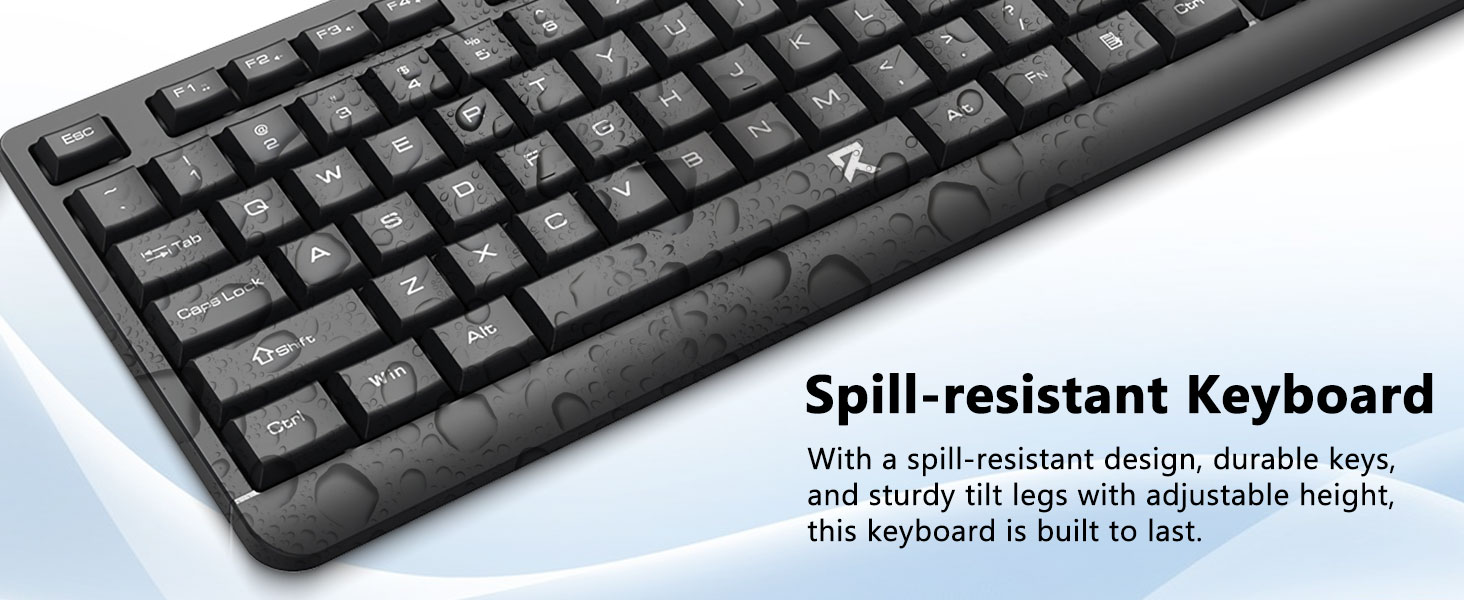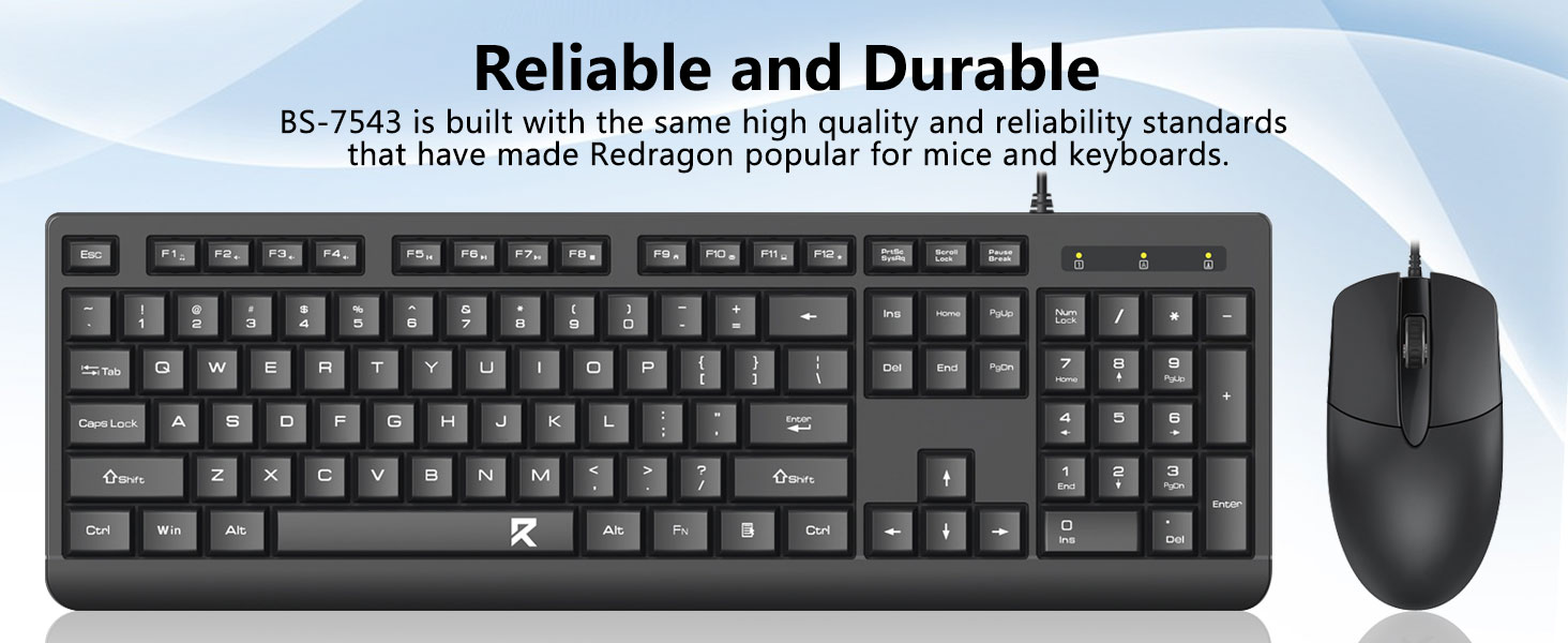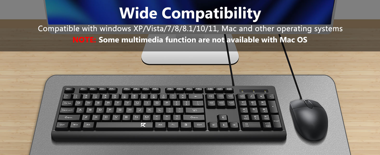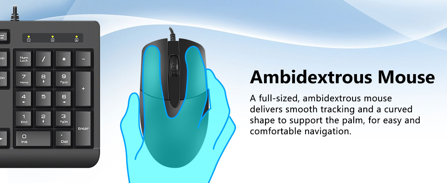 Das Tastaturlayout in voller Größe umfasst einen Ziffernblock, Multimediatasten und einen komfortablen Abstand zwischen den Tasten. Die mitgelieferte Maus ist für eine genaue Verfolgung und reibungslose Cursorbewegung über verschiedene Oberflächen konzipiert.