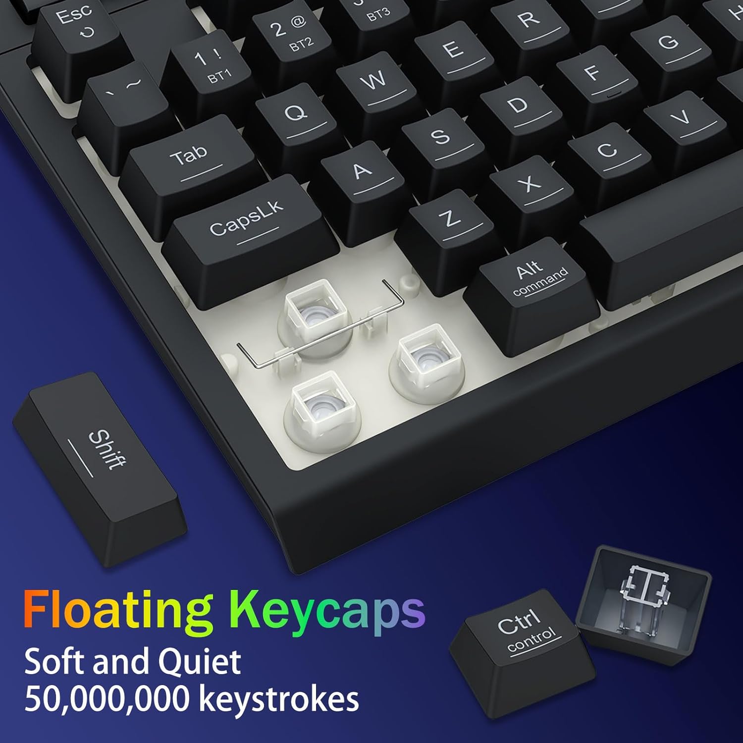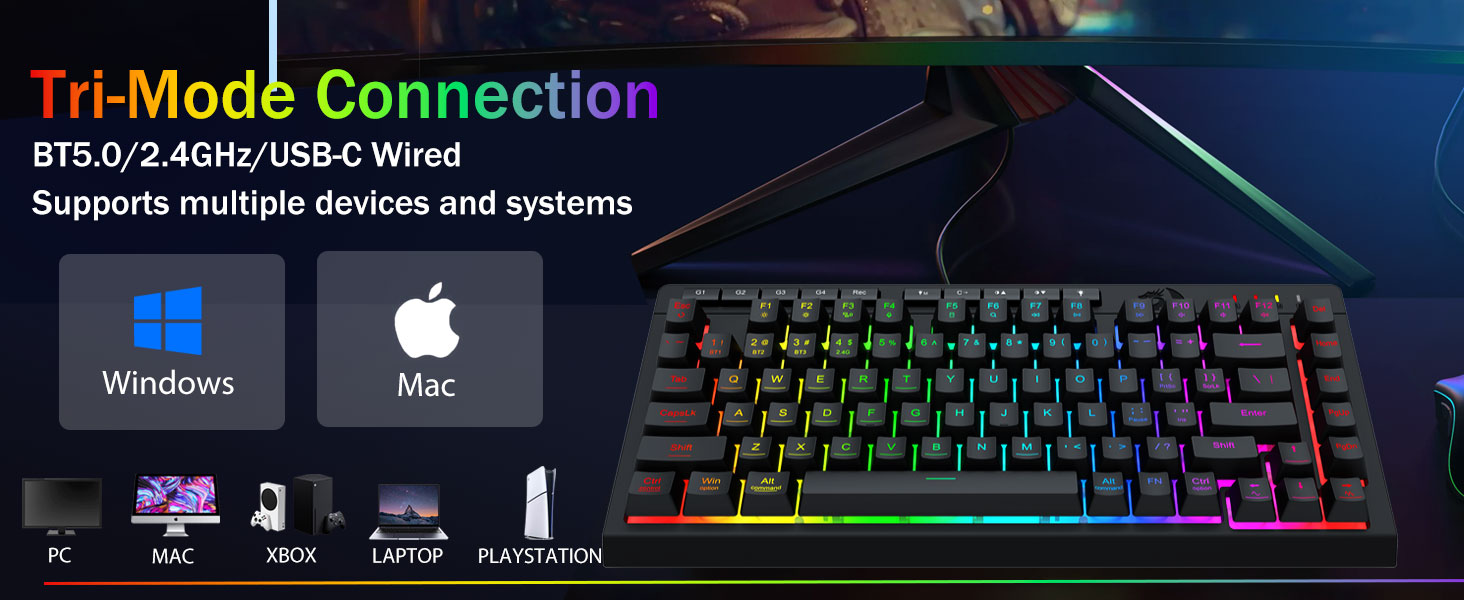 Tri-Mode-Vielseitigkeit und Beherrschung mehrerer Geräte- Wechseln Sie nahtlos zwischen den Modi Bluetooth 5.0, 2,4 GHz kabellos oder USB-C kabelgebunden und verbinden Sie bis zu 5 Geräte gleichzeitig (PC, Mac, Tablets, Telefone, PS/XBOX).