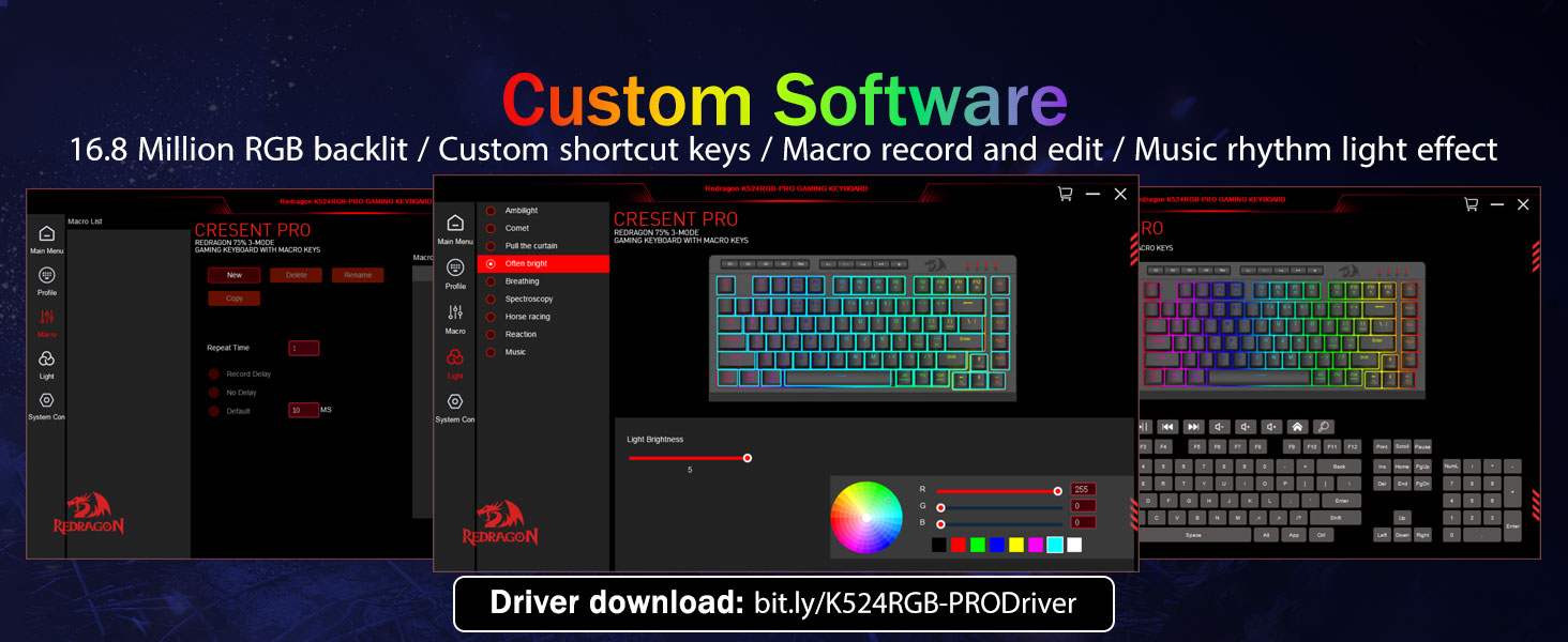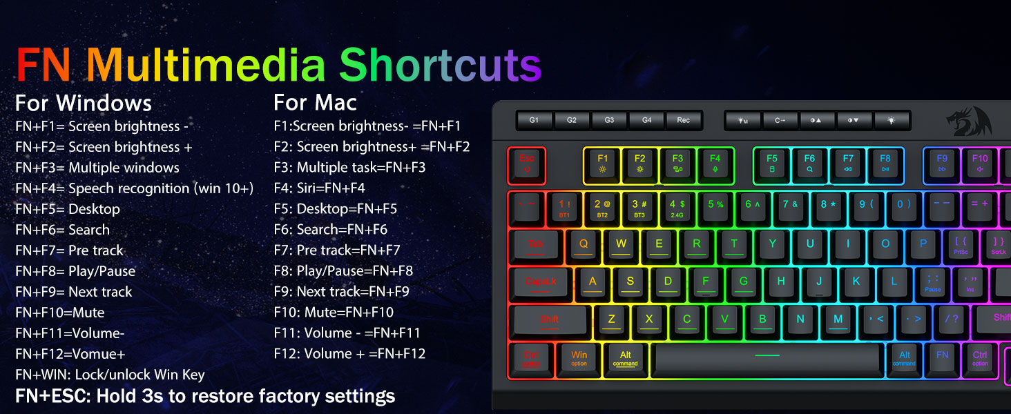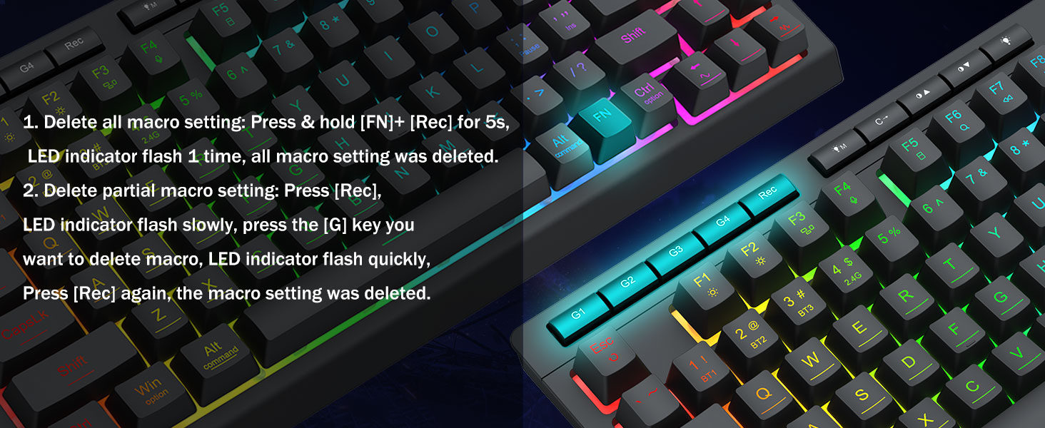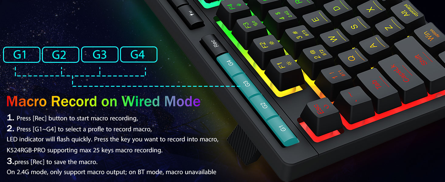 Anpassbare Makros, mühelose Steuerung- Programmieren Sie die 4 integrierten Makrotasten (G1–G4) sofort – keine Software erforderlich. Zeichnen Sie komplexe Kombinationen für Spiele, Verknüpfungen für Produktivität oder Medienbefehle auf. Definieren Sie Ihren Workflow in Sekundenschnelle neu. Sie können Software auch verwenden, um Funktionen anzupassen, Makros zu erstellen, RGB-Lichter anzupassen und Verknüpfungen festzulegen.