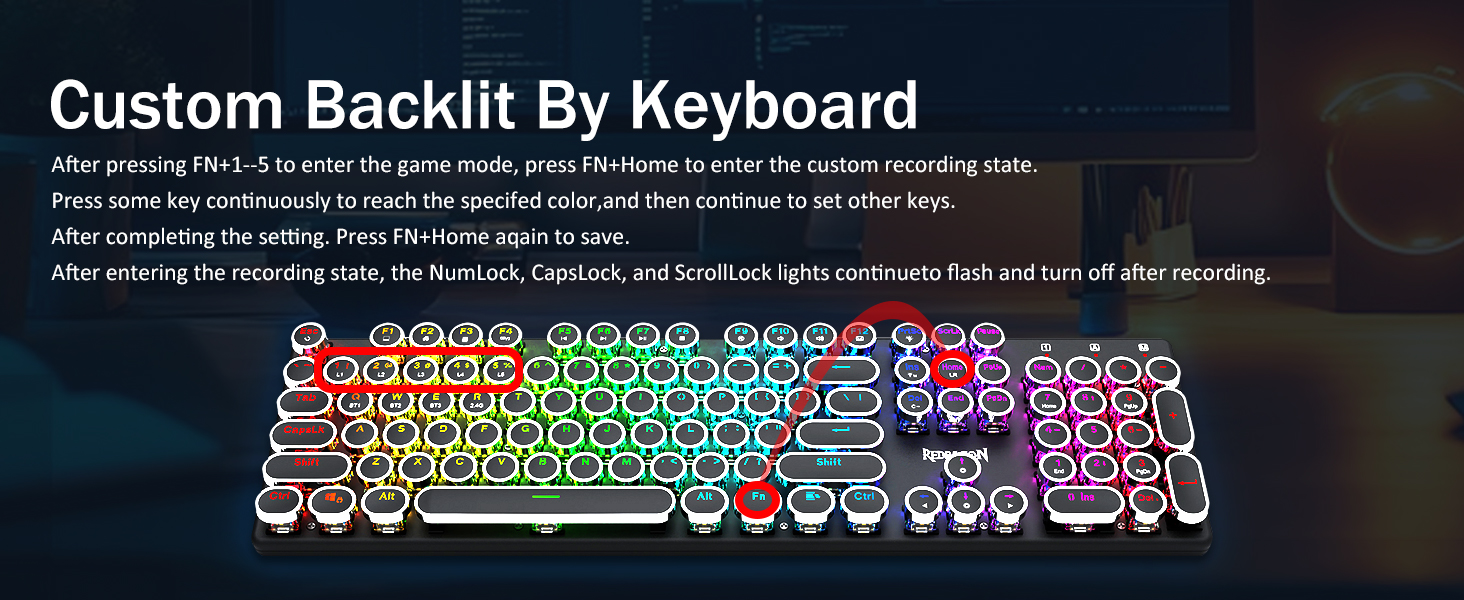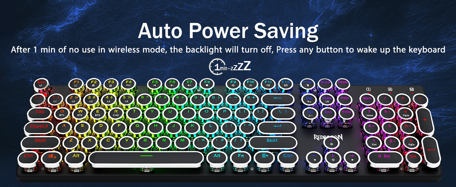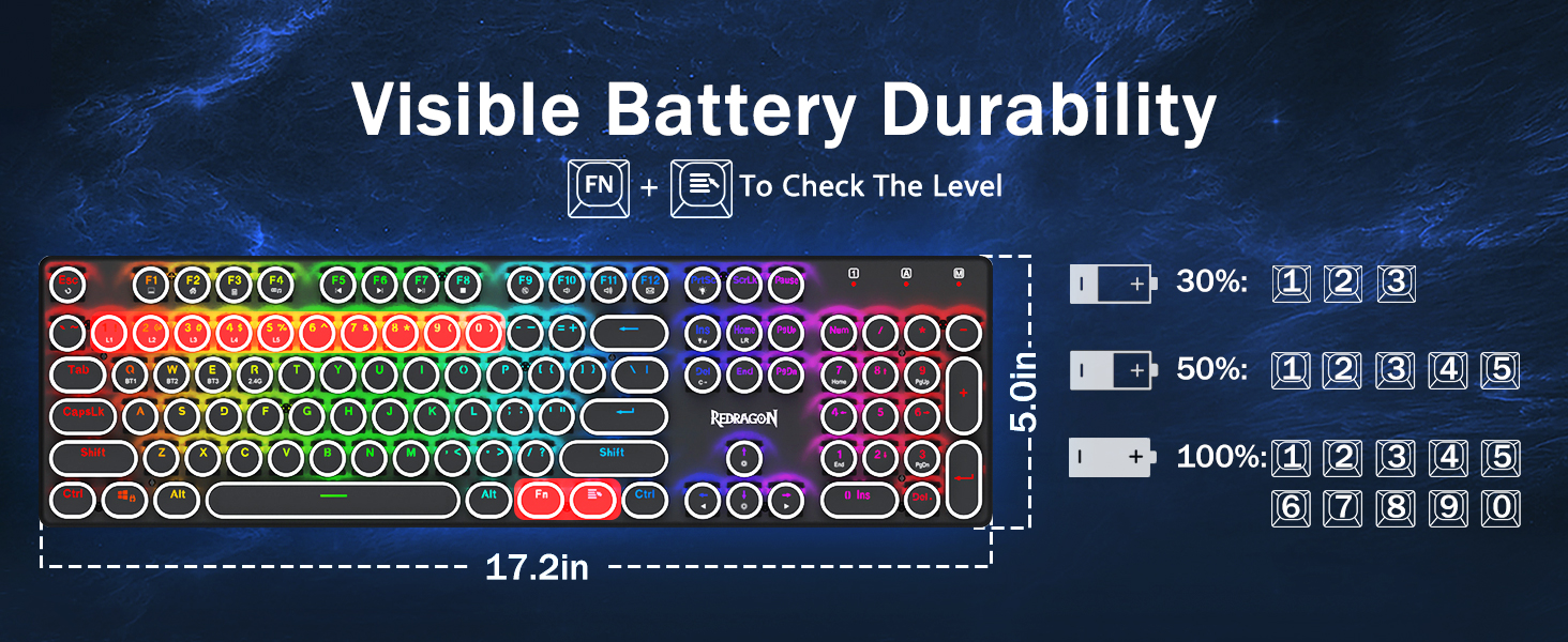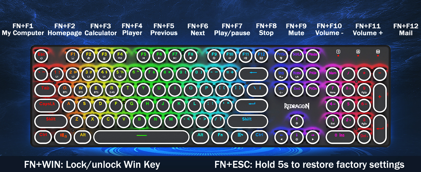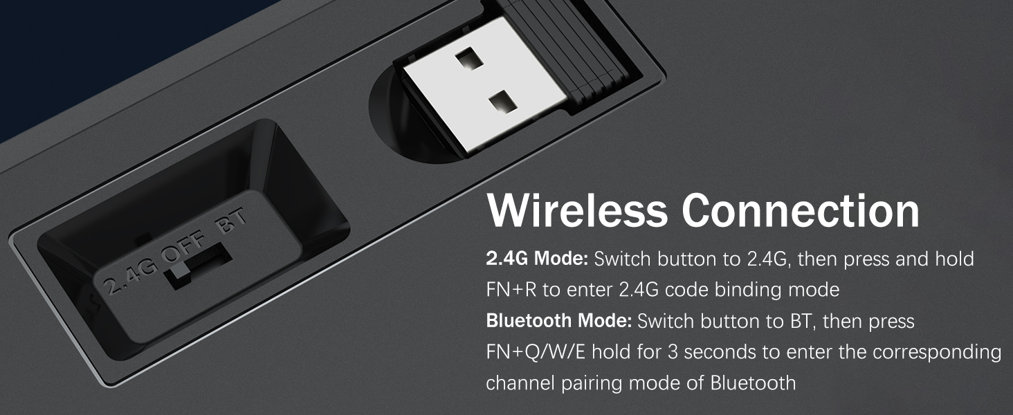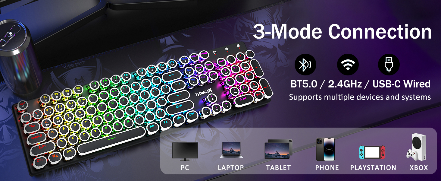𝟯-𝗠𝗼𝗱𝗲 𝗖𝗼𝗻𝗻𝗲𝗰𝘁𝗶𝗼𝗻 -Ausgestattet mit der innovativen Tri-Mode-Verbindungstechnologie von Redragon, USB-C kabelgebunden, Bluetooth 5.0/3.0 und 2,4 GHz Wireless-Modi, die das Benutzererlebnis in allen Bereichen auf ein neues Niveau heben. Drücken Sie FN+Q/W/E, um in den Bluetooth-Modus zu wechseln, drücken Sie FN+R, um in den 2,4G-Modus zu wechseln.