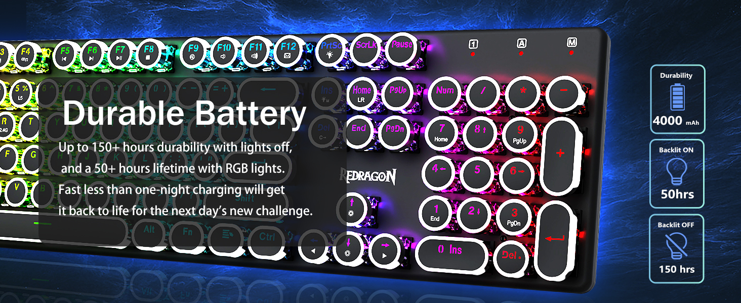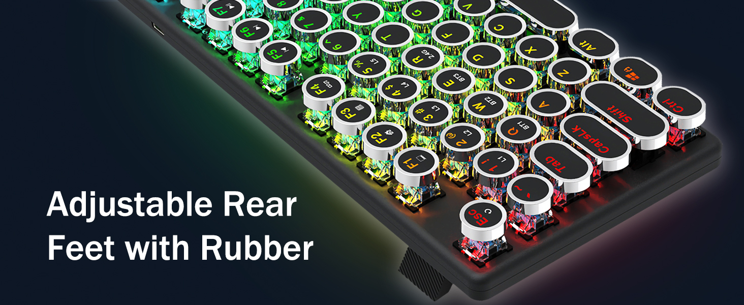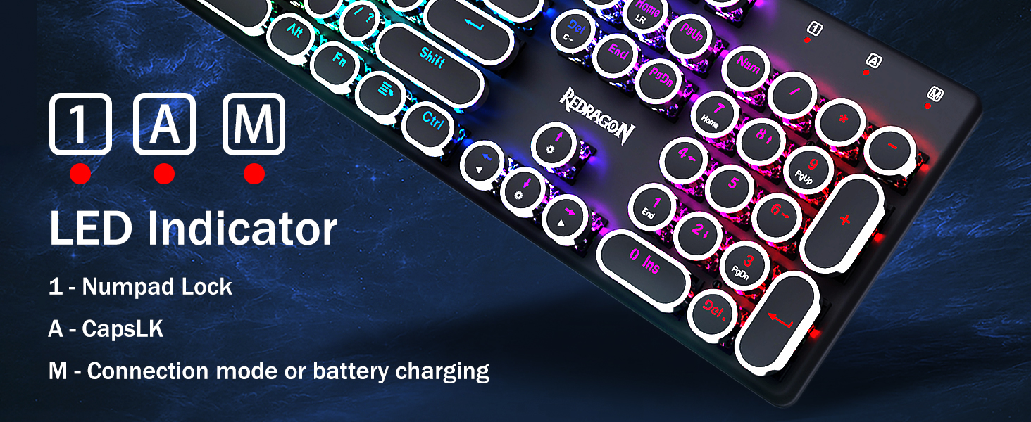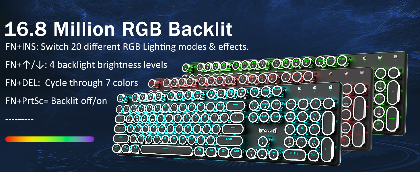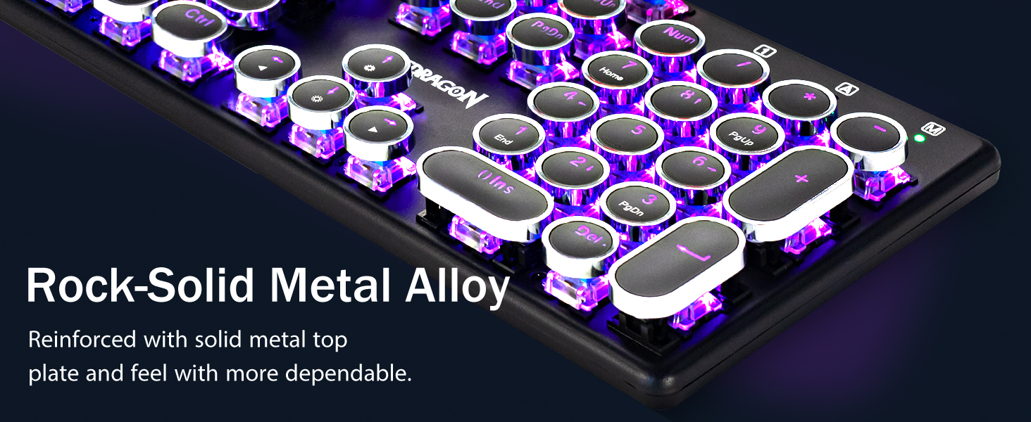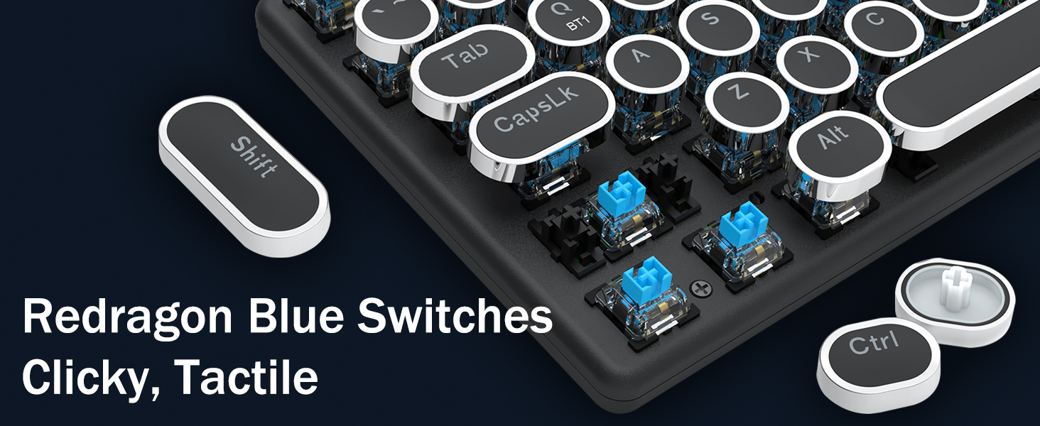 𝗥𝗲𝘁𝗿𝗼 𝗧𝘆𝗽𝗲𝘄𝗿𝗶𝘁𝗲𝗿 𝗦𝘁𝘆𝗹𝗲 𝘄𝗶𝘁𝗵 𝗠𝗲𝗰𝗵𝗮𝗻𝗶𝗰𝗮𝗹 𝗞𝗲𝘆𝘀 -Die mechanischen blauen Schalter von Redragon bieten einen mittleren Widerstand, einen hörbaren Klick-Klack-Sound und ein taktiles Feedback und sorgen für eine reaktionsschnelle und präzise Spielumgebung und Leistung. Die runden Tastenkappen der Vintage-Steampunk-Tastatur sehen aus wie eine klassische Schreibmaschine und sorgen für ein angenehmes Tippgefühl und ein stabiles Klickgefühl.