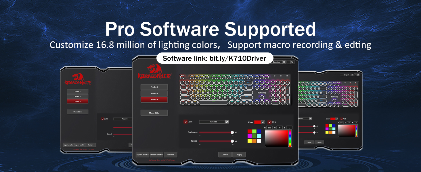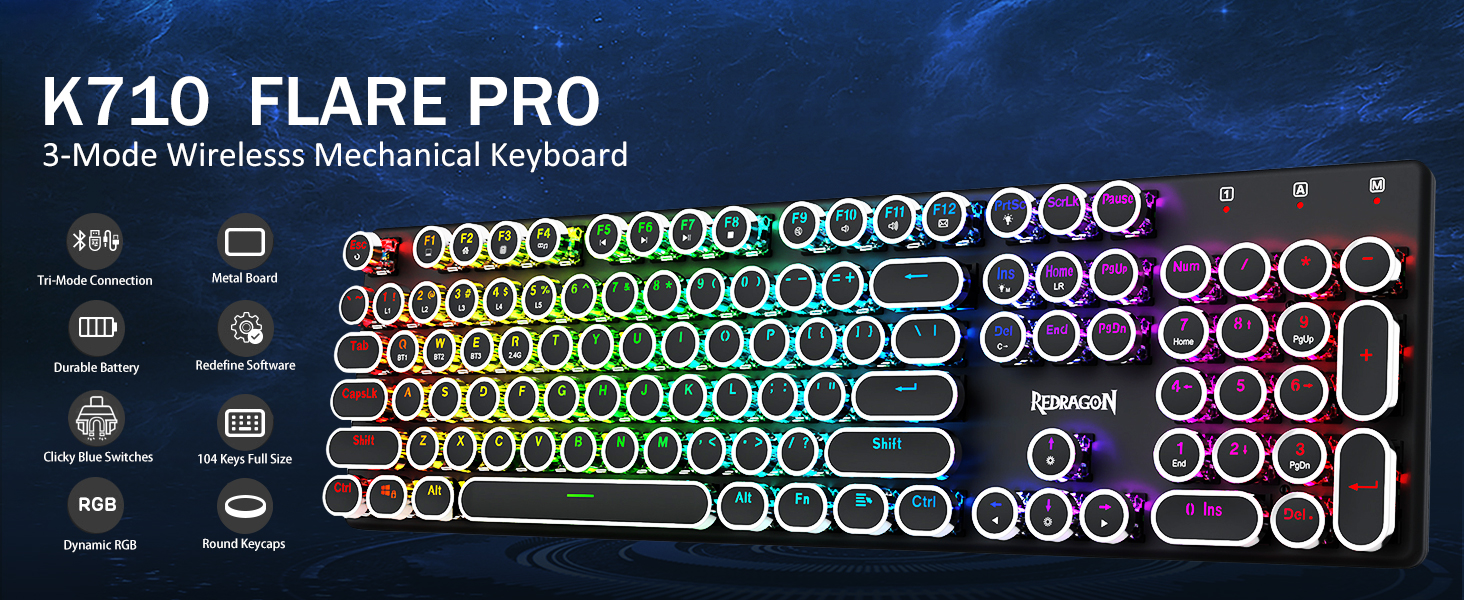 𝗣𝗿𝗼 𝗦𝗼𝗳𝘁𝘄𝗮𝗿𝗲 𝗦𝘂𝗽𝗽𝗼𝗿𝘁𝗲𝗱 -Chuangquan ist auf die Herstellung der kabellosen mechanischen Gaming-Tastatur Redragon Black K710 im Schreibmaschinenstil spezialisiert, die für Händler entwickelt wurde, die herausragende Produkte suchen. Diese Tastatur kombiniert ein Retro-inspiriertes Design mit einer robusten Metallplatte und 104-Tasten-Anti-Ghosting-Technologie und sorgt so für Präzision bei intensivem Gameplay. Seine mechanischen blauen Schalter sorgen für ein reaktionsschnelles taktiles Feedback, während die dynamische RGB-Hintergrundbeleuchtung das Eintauchen in das Erlebnis fördert. Mit vielseitiger Bluetooth-, 2,4-GHz-Wireless- und Kabelkonnektivität passt sich das K710 mühelos an mehrere Geräte an. Unterstützt durch anpassbare Software für Makros und Lichteffekte richtet es sich sowohl an Gamer als auch an Profis. Als vertrauenswürdiger Fabriklieferant garantiert Chuangquan eine strenge Qualitätskontrolle, kostengünstige Preise und flexible Anpassungen für Großhandelspartner weltweit.