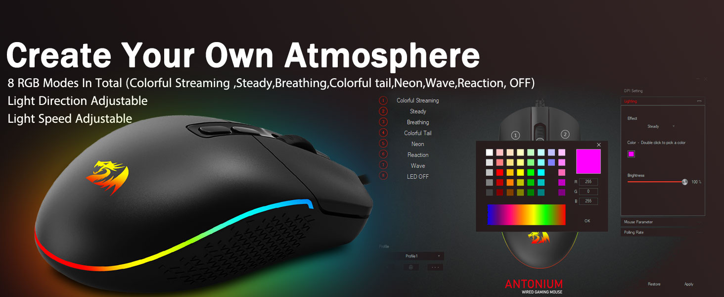 8 anständige RGB-Hintergrundbeleuchtungsmodi- Schalten Sie die Hintergrundbeleuchtung ein und erledigen Sie einige Kills auf Ihrem Gaming-Schlachtfeld. Die angesagte dynamische RGB-Hintergrundbeleuchtung wird Sie bei der Dekoration Ihres Gaming-Bereichs nie im Stich lassen, besser wäre es mit anderen Redragon-Accessoires mit eingeschalteten Lichtern.