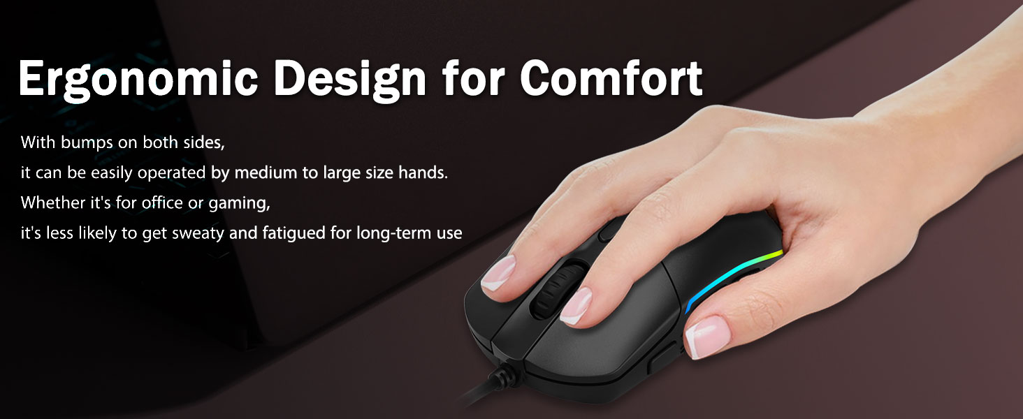 Komfortgriff- Durch die ergonomischen Noppen auf beiden Seiten passen Gaming-Mäuse in jede Hand. Es bietet den Spielern lang anhaltenden Komfort, ohne Ermüdungserscheinungen, selbst bei stundenlangem, intensivem Spielen. Es verrutscht nicht, wenn Sie die Gaming-Maus anheben oder schnelle und präzise Wischbewegungen ausführen.