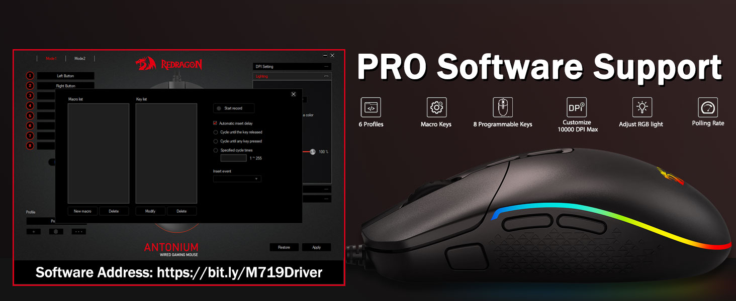 - Die M719-Maus ist mit 5 verfügbaren DPI-Stufen ausgestattet: DPI 400/800/1600/2400/4000. Einfacher Wechsel zwischen verschiedenen Spielanforderungen. DPI kann per Software um ±100 stufenlos von 100 bis 10.000 angepasst werden, um alle Ihre Anforderungen zu erfüllen. 4 Abfrageraten sind einstellbar: 125 Hz/250 Hz/500 Hz/1000 Hz, eine hohe Abfragerate sorgt für eine reibungslose und schnelle Bewegung.