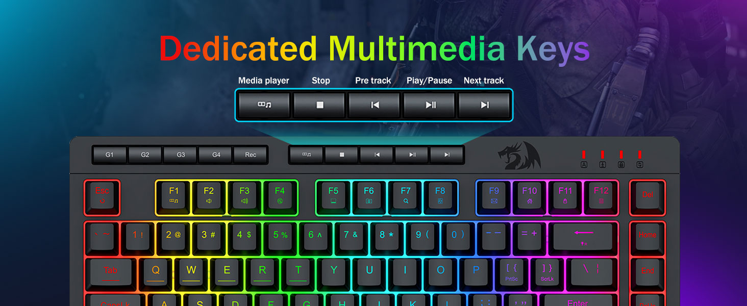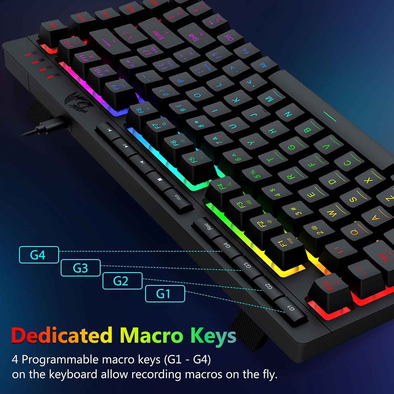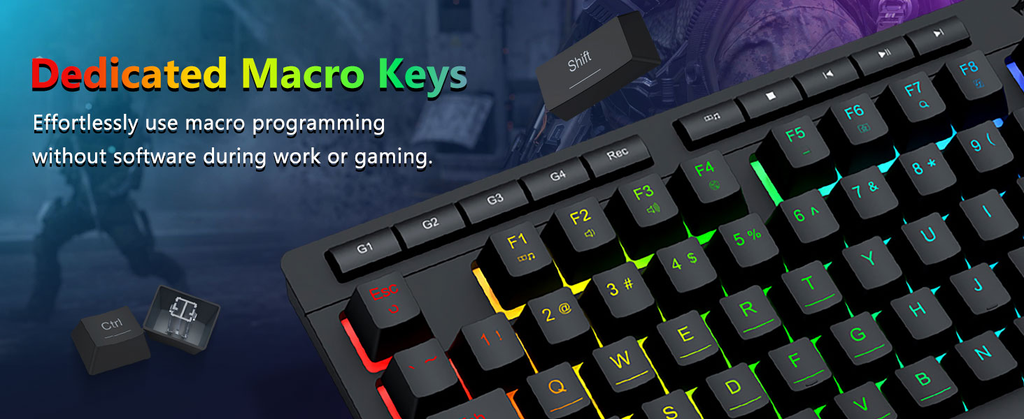 【Effizient und praktisch】Diese Kombination aus Gaming-Tastatur und -Maus ist mit 4 integrierten Makrotasten, 5 unabhängigen Multimedia-Tasten und 12 FN-Multimedia-Funktionstasten ausgestattet und lässt sich einfach und bequem bedienen. Es verbessert nicht nur die Effizienz, sondern macht Ihren Spielprozess auch komfortabler und schneller