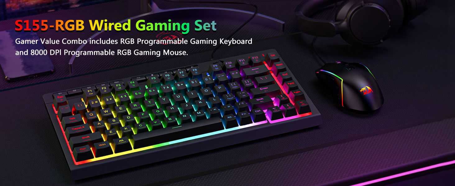 Schwarze S155-Kombination aus kabelgebundener Gaming-Tastatur und -Maus mit RGB-Hintergrundbeleuchtung