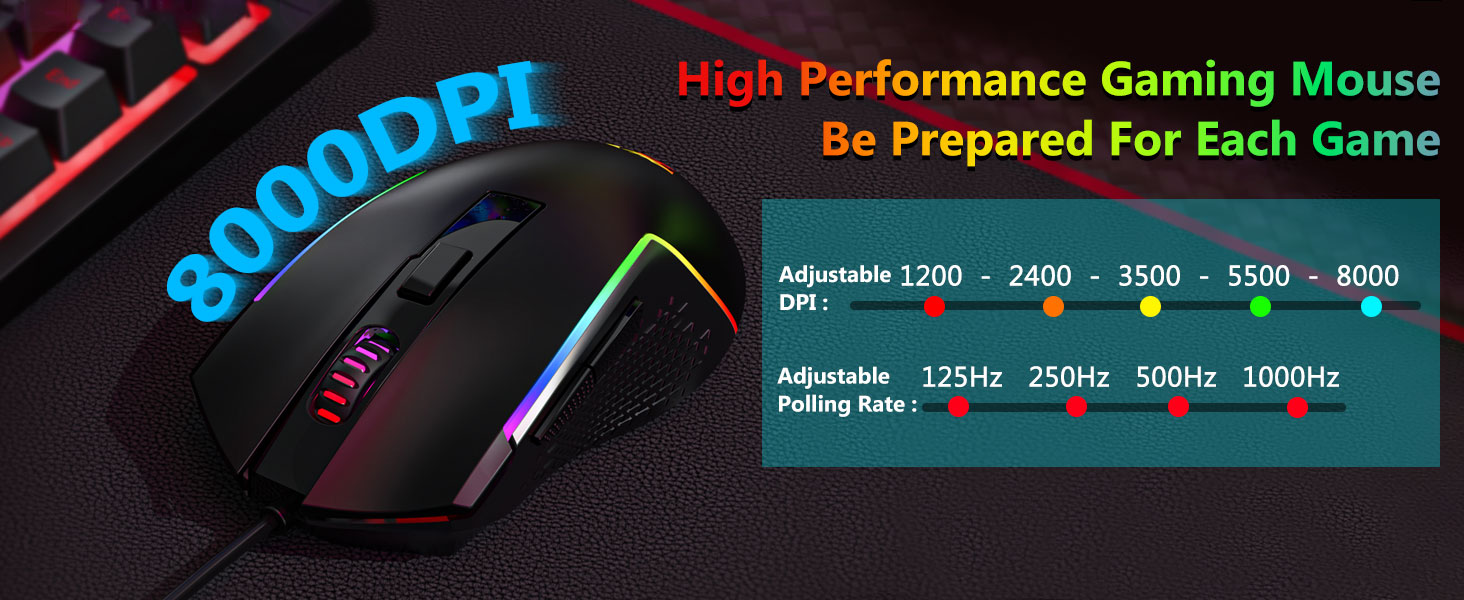 【Professionelle Gaming-Maus】Sie können die DPI über die DPI-Taste von 1200 bis 8000 oder über den Softwaretreiber von 100 bis 8000 anpassen, um Ihren unterschiedlichen Anforderungen beim Spielen oder Arbeiten problemlos gerecht zu werden. Insgesamt 7 Tasten, davon 6 programmierbar. Der hochpräzise Sensor liefert punktgenaue Genauigkeit, während die Mikroschalter in Gaming-Qualität für Langlebigkeit, größere Haltbarkeit und extreme Reaktionsfähigkeit sorgen und Ihnen einen noch größeren Vorsprung gegenüber Ihrer Konkurrenz verschaffen. (Die Software unterstützt auch die Anpassung der Maus-Abfragerate auf bis zu 1000 Hz)