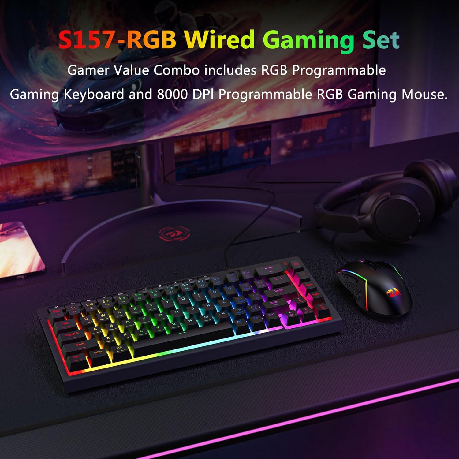 Schwarze S157-Kombination aus kabelgebundener Gaming-Tastatur und -Maus mit RGB-Hintergrundbeleuchtung