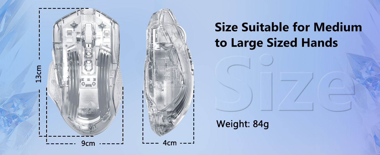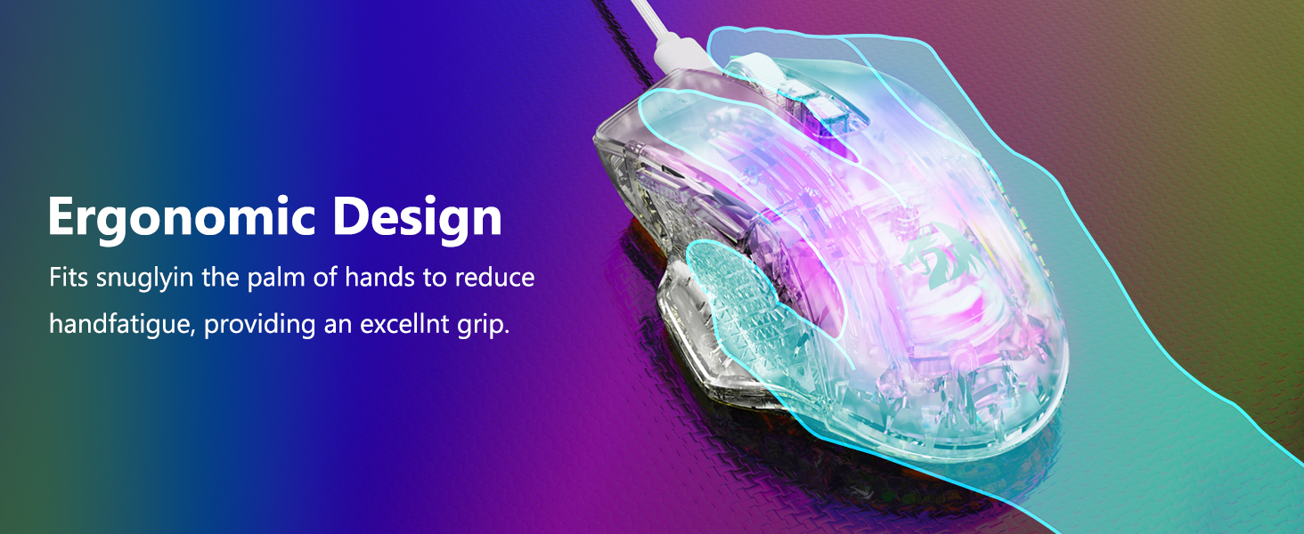 Die Maus ist so geformt, dass sie natürlich in der Hand liegt und eine längere Nutzung ohne übermäßige Belastung ermöglicht. Seine Struktur ermöglicht bequeme Griffarten, einschließlich Handflächen-, Krallen- und Fingerspitzengriffe.